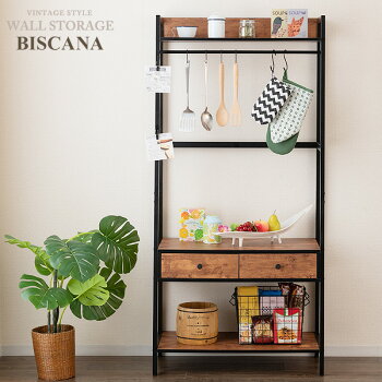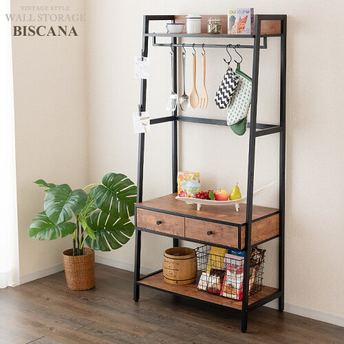 【8/25は全品ポイント5倍】【送料無料】引き出し付 キッチンラック レンジ台 トースター台 炊飯器ラック キッチン収納棚 木製ラック おしゃれ アイアンラック スリム 省スペース 幅80 アジアンインテリア ドウシシャ 壁面収納家具 ビスカーナ bc8017h-hr