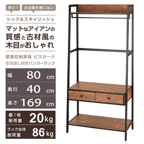 商品スペック商品名/型番 壁面収納家具 BISCANA ビスカーナ W80 引き出し付きハンガーラックBC8017H-HRカテゴリスチールラック分 類ウッドラックサイズ幅80×奥行40×高さ169cm JANコード4550283771723耐荷重棚板1枚あたり:約20kgハンガーバー:約20kg引き出し1個あたり:約3kg セット内容 天板×1、底板×1、側板×2、背板×1、棚板だ(大)×1、棚板(小)×1、背板(棚)×1、前板(引き出し)×1枚、側板(引き出し)×2、向板(引き出し)×1、底板(引き出し)×1、本体フレーム脚(上)×2本、本体フレーム脚(下)×2本、ハンガーバー×1本、横バー×1本、ジョイント×4個、アジャスター(足パーツ)×4個、背板固定具×6、引き出し用つまみ×1、スライドレール・カムロック・ダボ・各種ネジ、組立用ドライバー×1本、取扱説明書(組立説明書) 材質棚板:パーティクルボード(PVC加工)、フレーム:スチール(エポキシ塗装) 本体重量約25.1kg 梱包サイズ96×47×16cm、梱包重量:約26.3kg メーカー/ブランド株式会社ドウシシャ(DOSHISHA)商品仕様◆お客様にて組み立ての商品です。